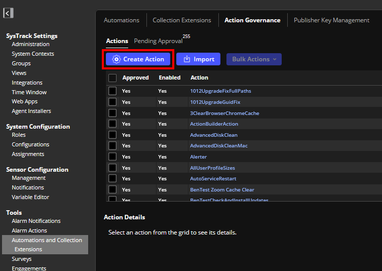 1. Go to Configure > Tools > Automations and Collection Extensions > Action Governance > Actions and click Create Action.