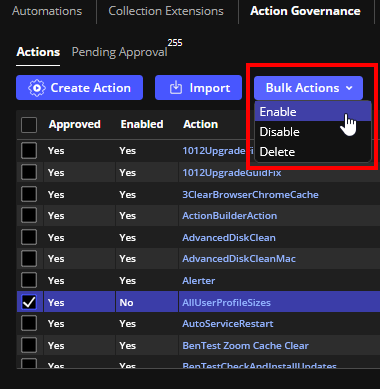 Go to Configure > Tools > Automations and Collection Extensions > Action Governance > Actions