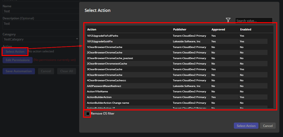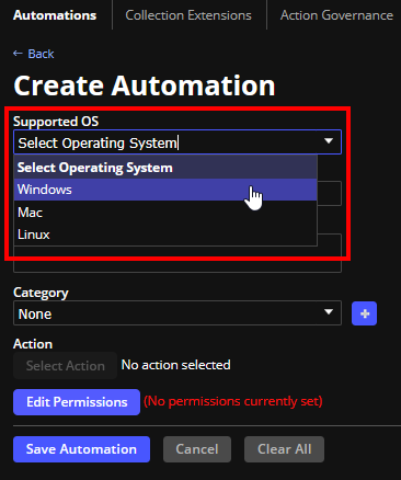 6. Click Select Action which opens up a filtered list of actions specific to the operating system that you chose.