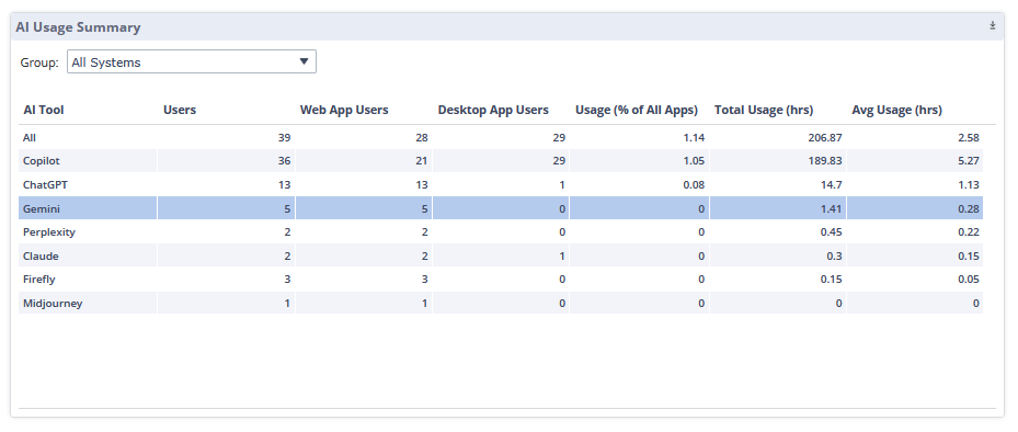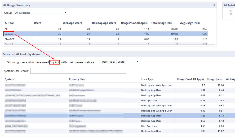 In this pane you can see detailed data for the applications you select in the AI Usage Summary pane.