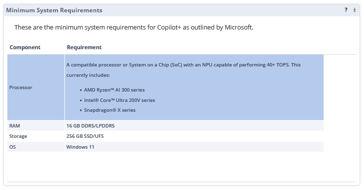 This dashboard assesses whether systems meet the minimum requirements for Copilot+.