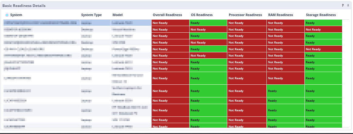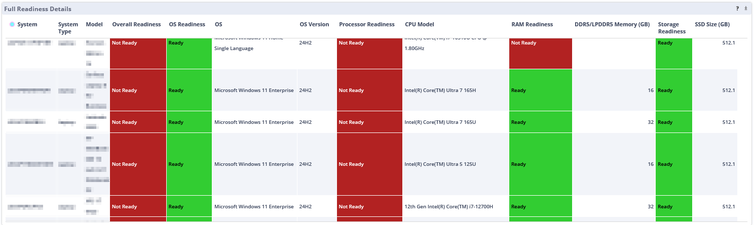 This pane lists all the systems in the selected group and shows whether they are Ready or Not Ready for each of the components listed in the Copilot+ requirements.