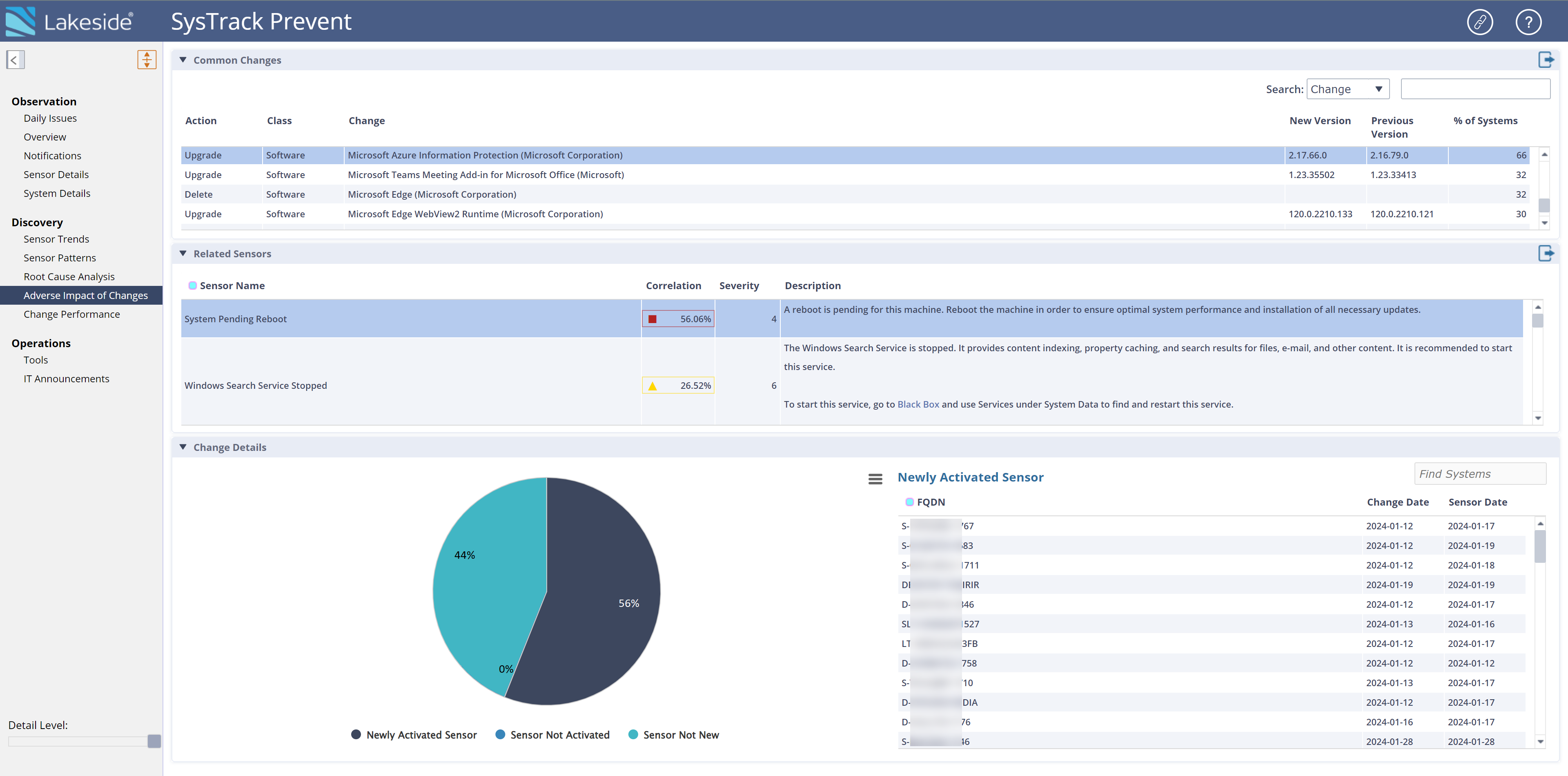 For the systems with this change, the pie chart in the Change Details section shows you that the System Pending Reboot sensor was activated on 44 percent of systems prior to the change, while 56 percent of systems had it activated shortly after the change, and 0 percent of systems do not have the sensor active at all.