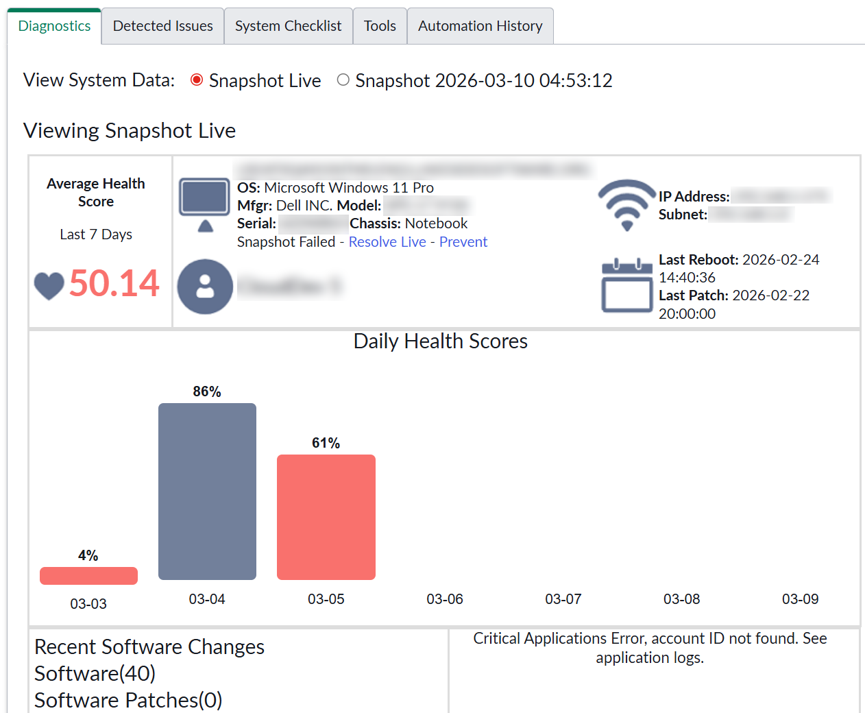 The first three tabs include the Viewing System Data selectors. Snapshot Live shows the data for the computer in real time at the time you view it. Snapshot YYYY-MM-DD shows the data as it was at the time that the incident occurred (the time of the time stamp). Your support technicians in ServiceNow can toggle between these two views and deduce what might have caused the incident based on the differences in the data.