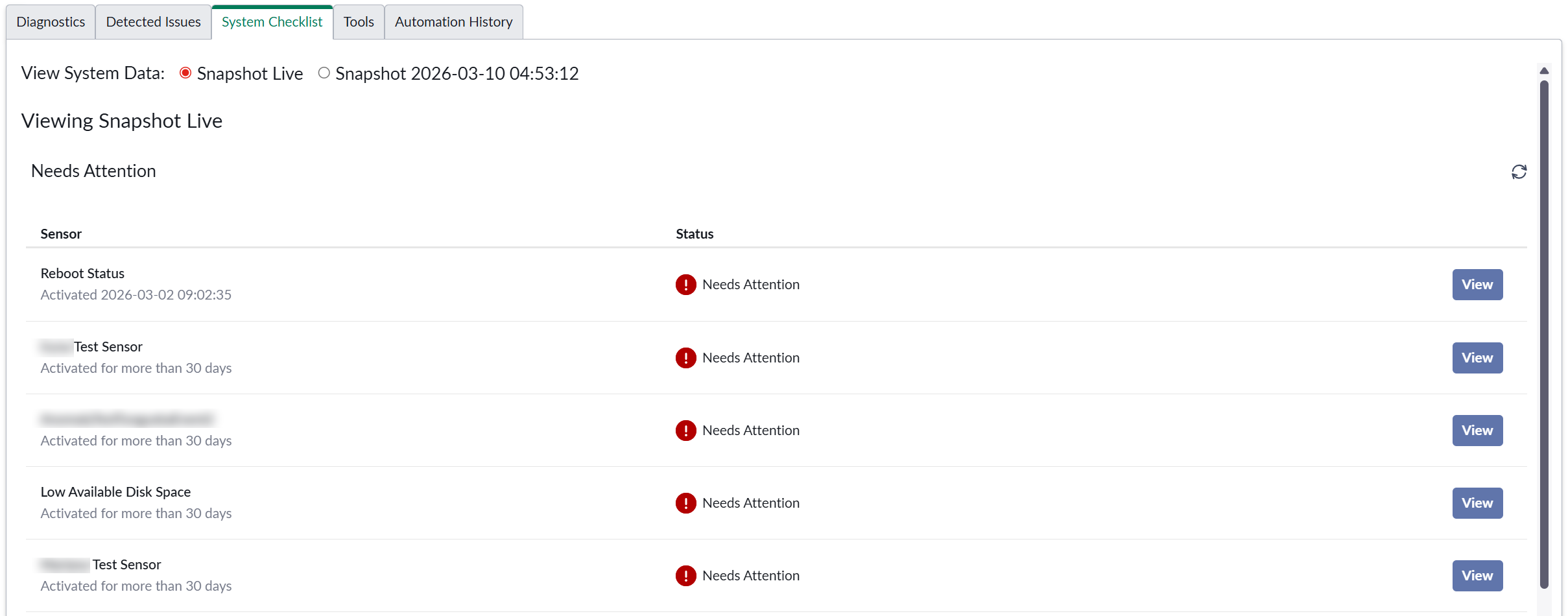 Click View next to a sensor to get more details about its status.