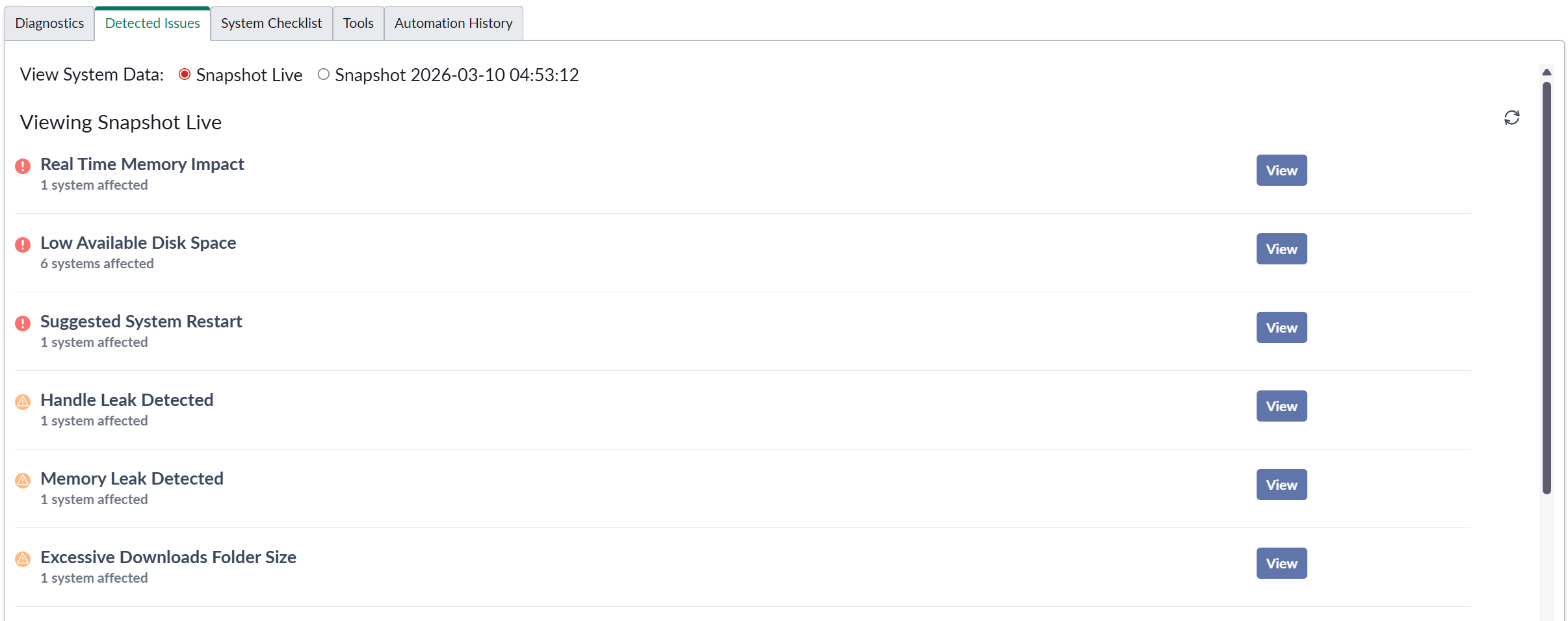 Resolve Live: This link opens SysTrack Resolve to show you the current, real-time snapshot data. (This is the same snapshot data that appears on this tab in ServiceNow if you select Snapshot Live next to Viewing System Data.)